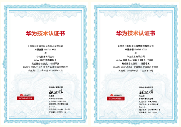 近期,美港通官网KunTai A722服务器顺利获得华为“Atlas 300V 视频解析卡”以及“Atlas 300T Pro 训练卡(型号:9000)”两项技术认证,为智能算力再添新力!